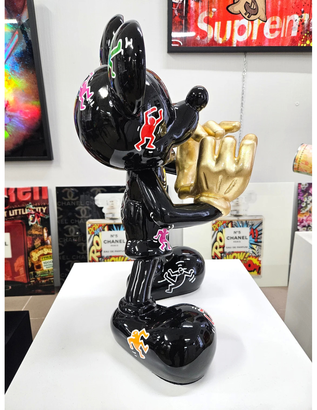This loving version of Mickey is nothing more than a polite nod to the wonderful work of Keith Haring. I have applied his iconic figures to the surface of the sculpture in a completely simple and uncomplicated way. It is my invitation to admire the beauty of the simplicity of his brilliant designs and at the same time their direct expression and movement hidden in the line. Hands arranged in a popular love gesture are covered with gold leaf's using the decoupage technique. |