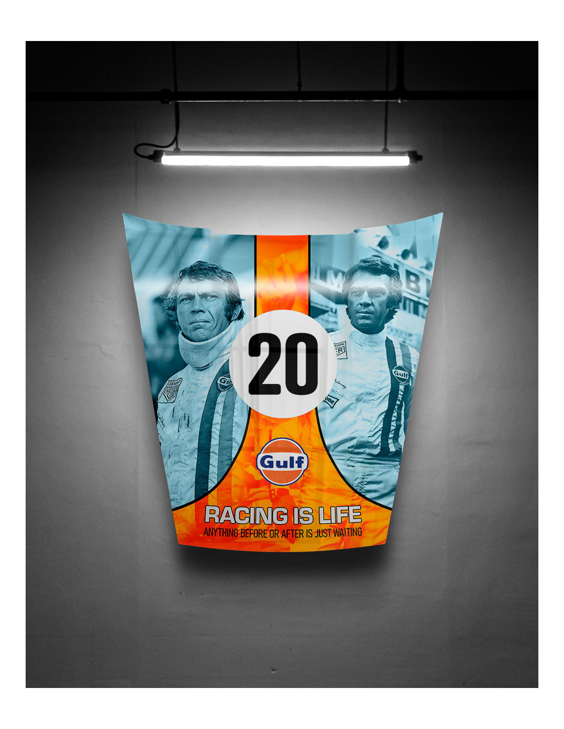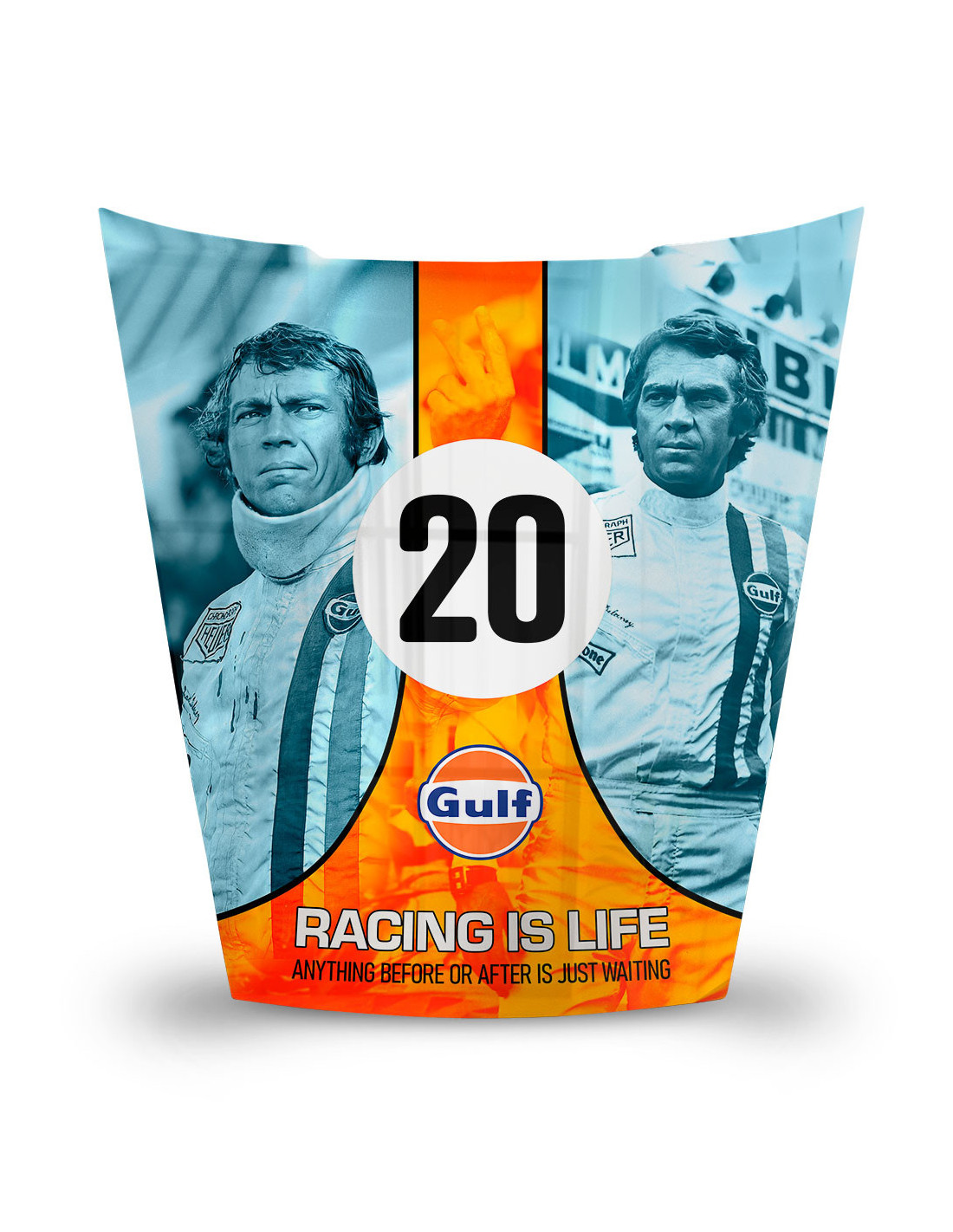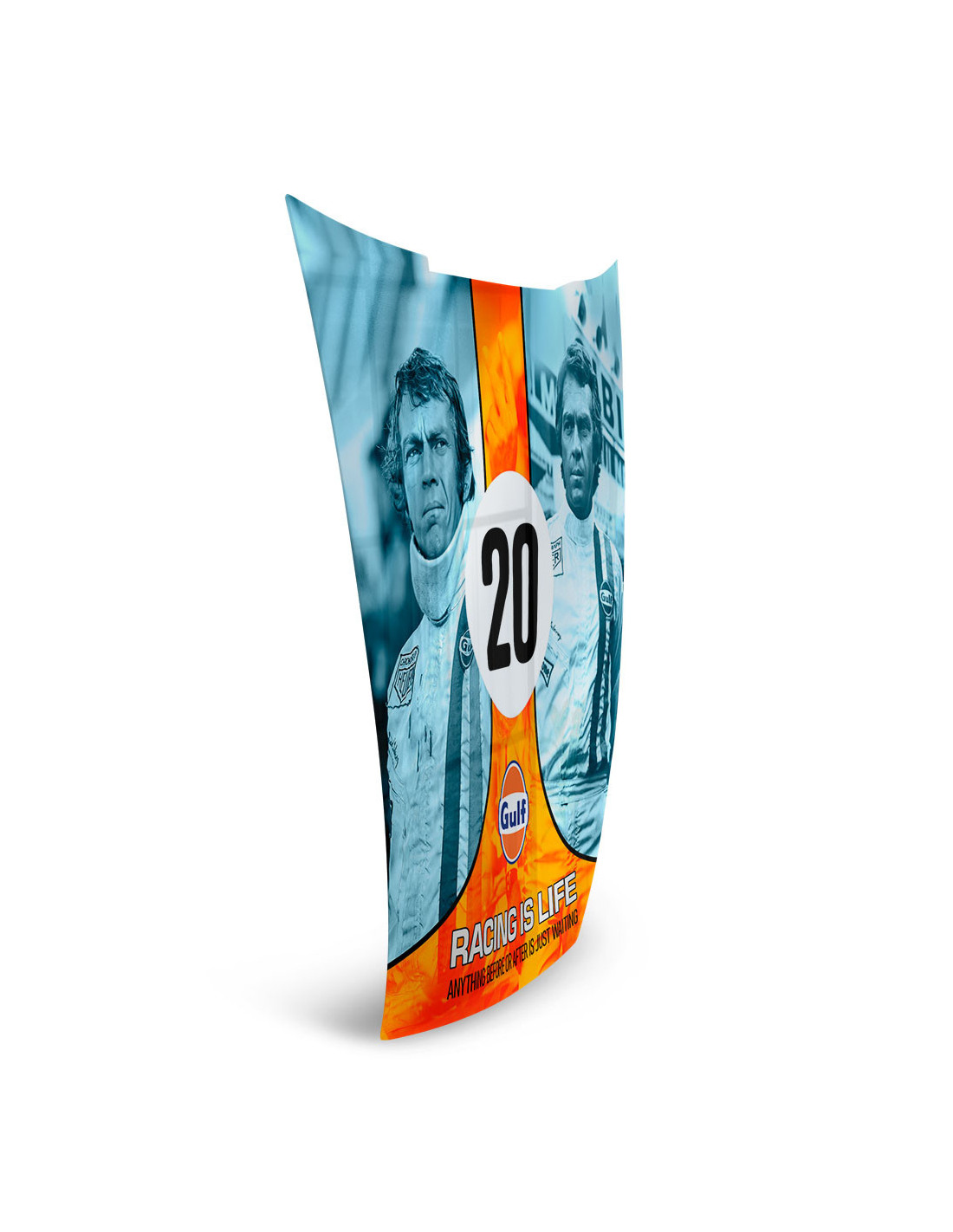 Ce capot exclusif n'est pas seulement un accessoire pratique, mais aussi l'expression d'une passion pour l'automobile. Les graphismes qui ornent le capot vous plongent dans l'univers de l'emblématique numéro 20 du véhicule et du logo de la marque Gulf, symbole de prestige et de tradition de la course automobile.
