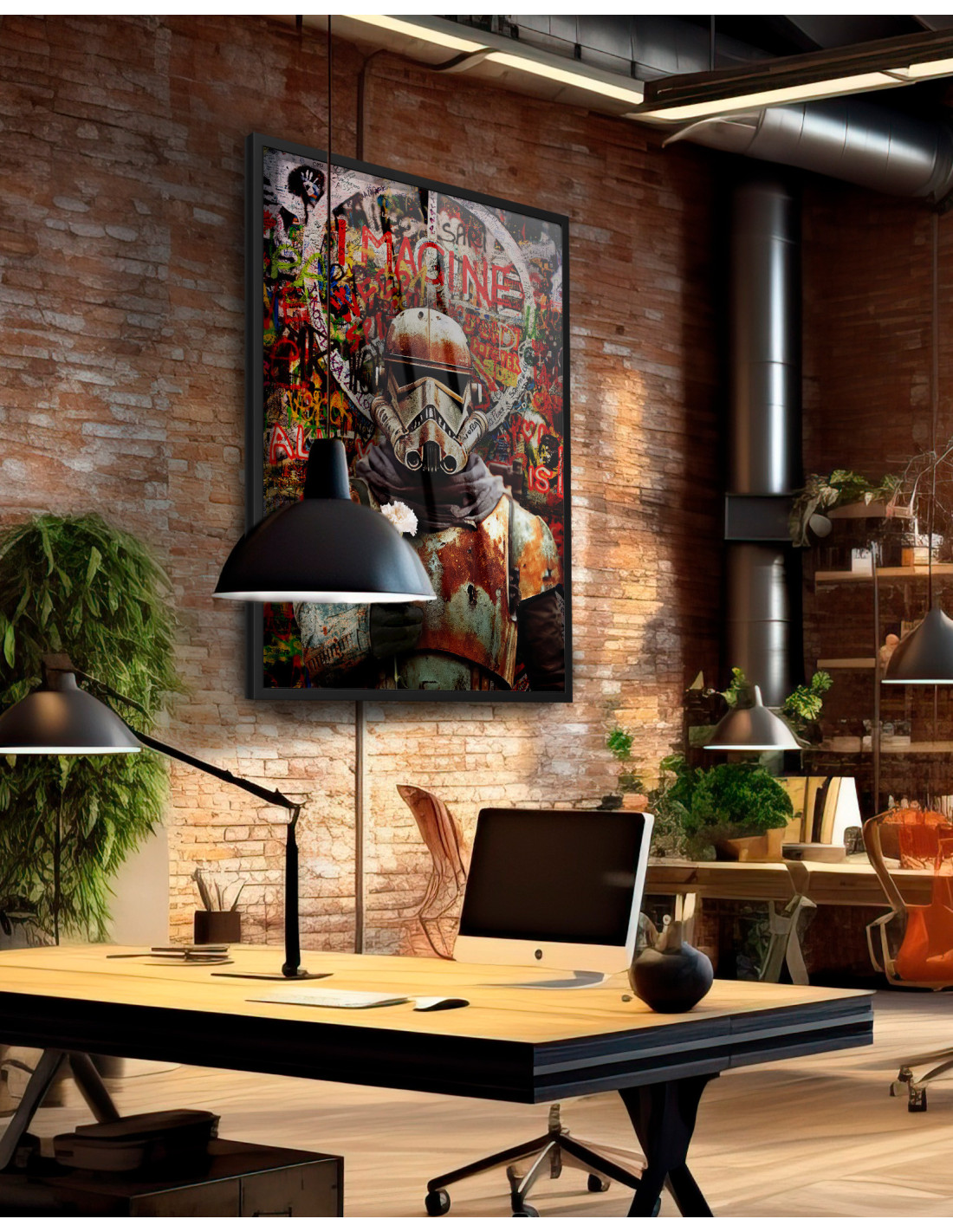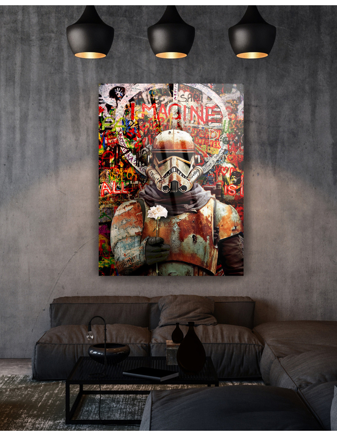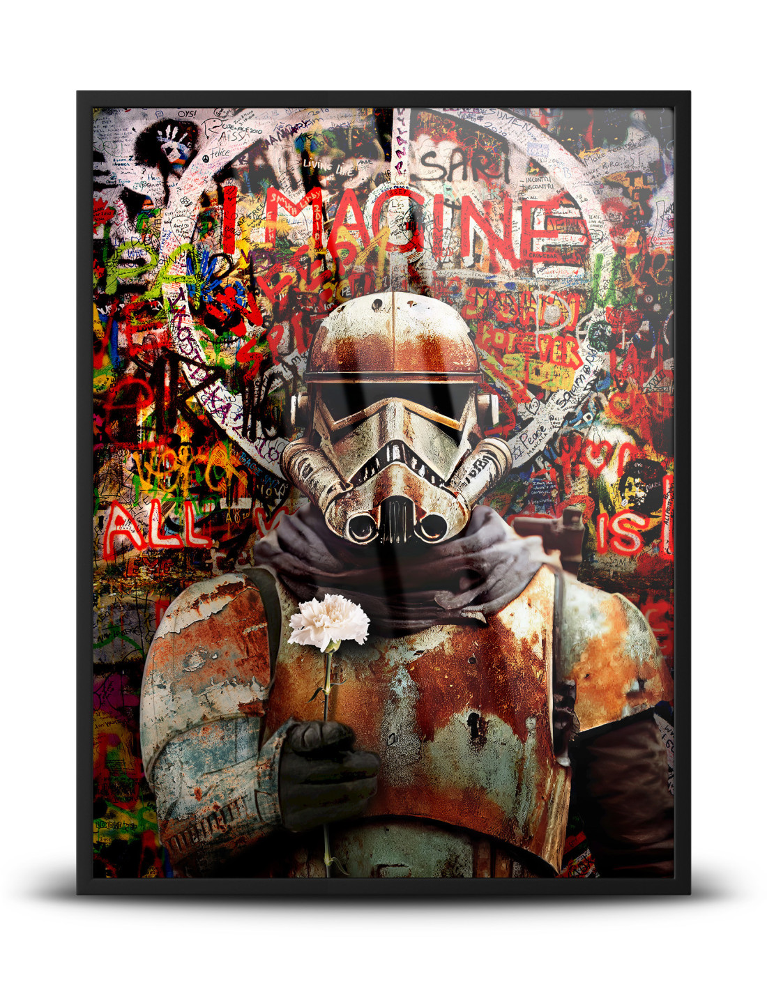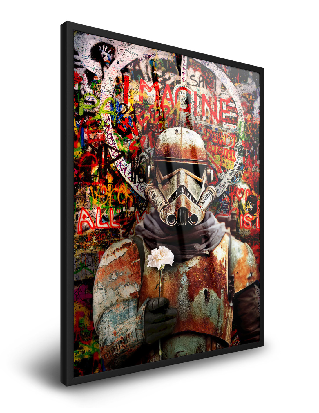 "Stars Wars - Peaceful Stormtrooper" to unikalny obraz, który łączy dynamiczny styl pop-artu z industrialnym, street-artowym charakterem. Klasyczna postać z filmowego uniwersum została przedstawiona w nietypowym ujęciu – jako symbol kontrastu pomiędzy wojną a spokojem. Klimatyczne, surowe tło w stylu graffiti i intensywne kolory nadają kompozycji wyrazistości, a detale nadają jej głębi.