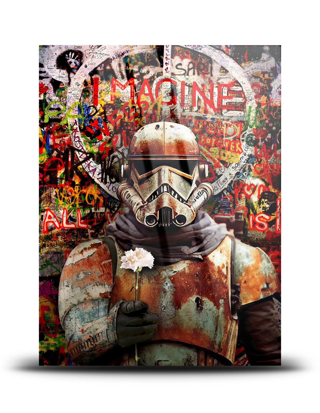 „Peaceful Stormtrooper” to wyjątkowy projekt artystyczny, w którym kultowa postać szturmowca z filmowego uniwersum zostaje przeniesiona na transparentne pleksi o grubości 5 mm. Dzięki połączeniu dynamicznego stylu pop-artu z surową estetyką street-artu oraz technologii druku UV na plexi, każda detaliczna linia i intensywna barwa są wyjątkowo wyraziste. Motyw wojny zostaje tu zestawiony z symbolem wewnętrznego spokoju, tworząc inspirujące napięcie wizualne.