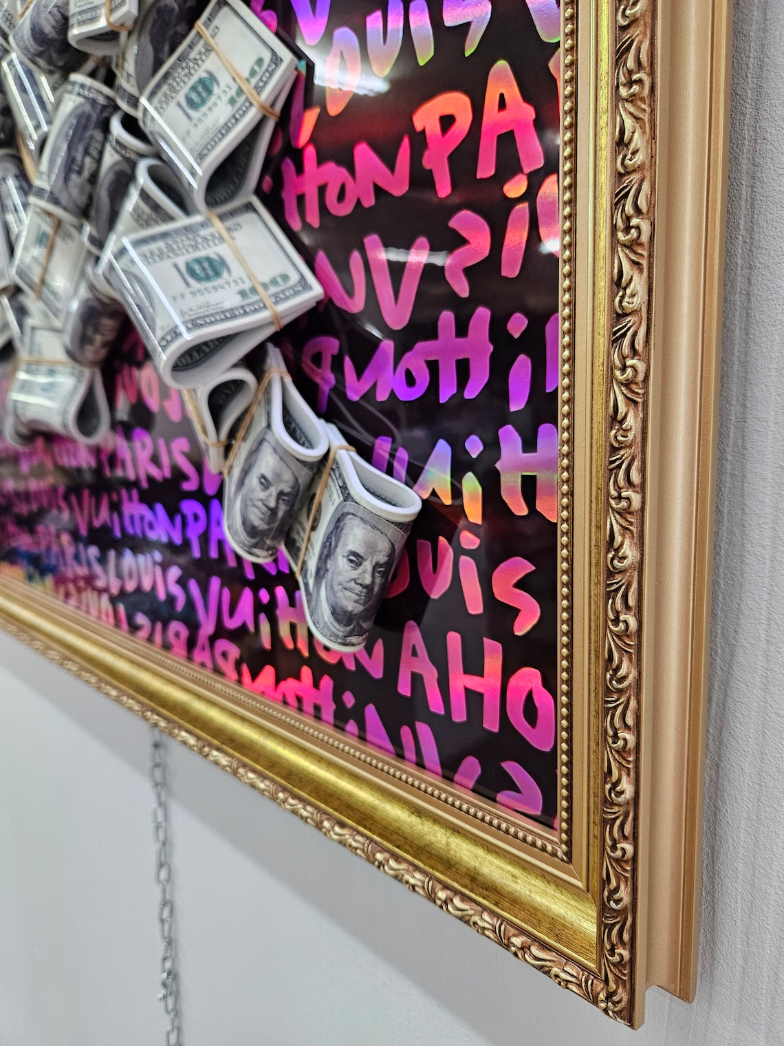 Patryk Konrad prezentuje wyjątkowy, limitowany holograficzny wydruk o modowym charakterze, w którym wplecione zostały motywy plików dolarów i złotej ramy. To nie tylko obraz – to manifest luksusu i przepychu, który przyciąga wzrok i wprowadza do wnętrza nutę blichtru. Połączenie pop-artowych elementów z modowym wyrazem sprawia, że każde pomieszczenie zyskuje niepowtarzalny klimat, a gra świateł na holograficznym tle zmienia się wraz z kątem padania promieni.